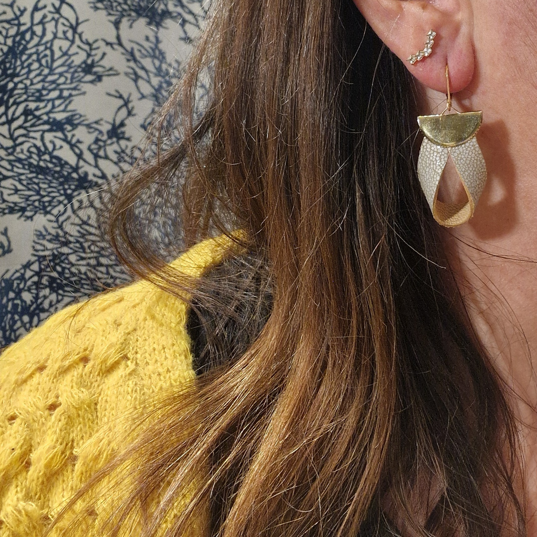 Ces boucles d’oreilles artisanales en cuir sont originales et sobres. La boucle est une déclinaison de la créole classique. Pour cette création originale, je m’adapte à vos goûts : suite à votre réservation, je vous proposerai différents cuirs et textures.