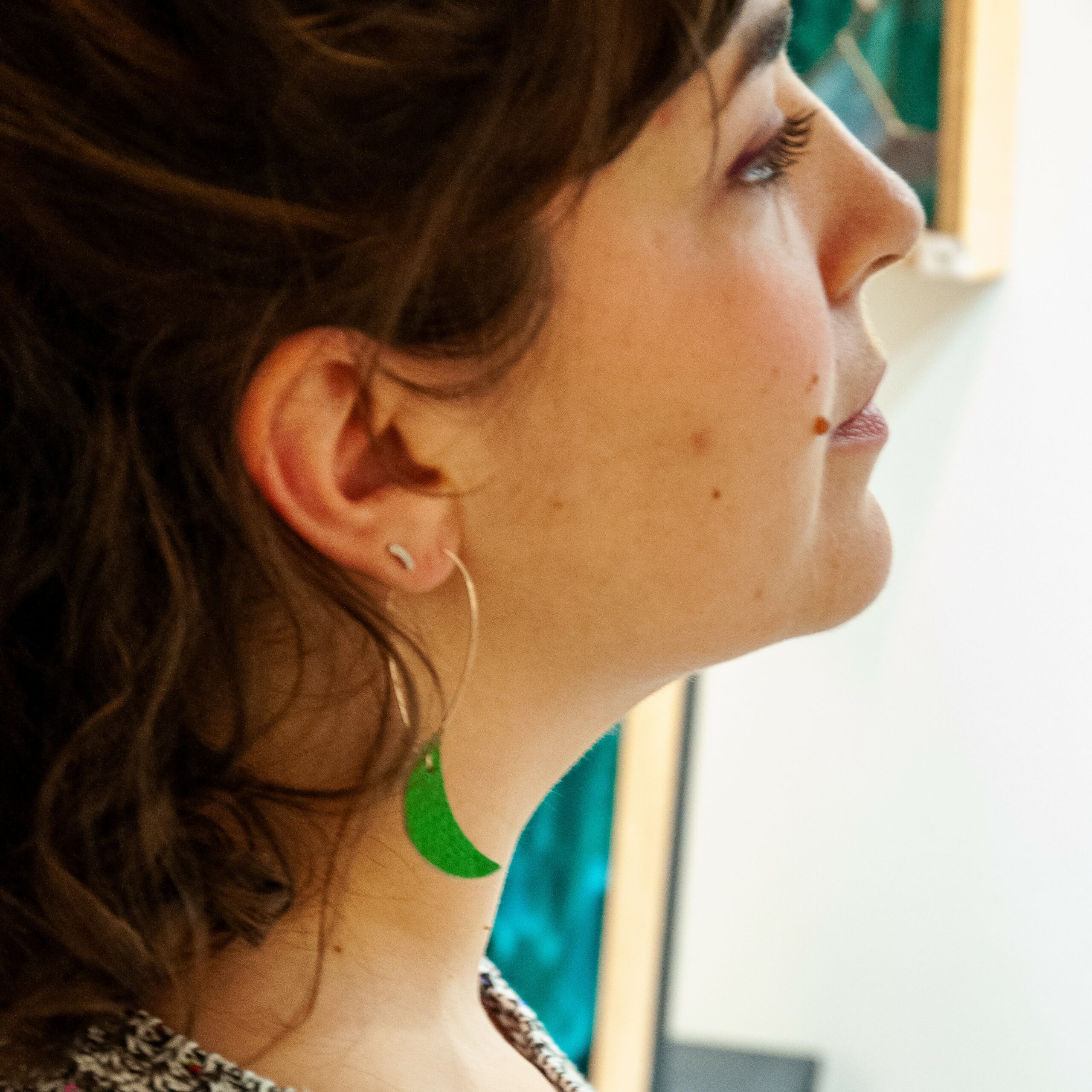 Chaque boucle est composée d’une dormeuse de 1,5 cm ou d’une créole de 4,5cm. Ajoutez à cela une feuille en cuir de 2,5cmx4,5cm et une colombe en cuir de 4cmx4,5cm.