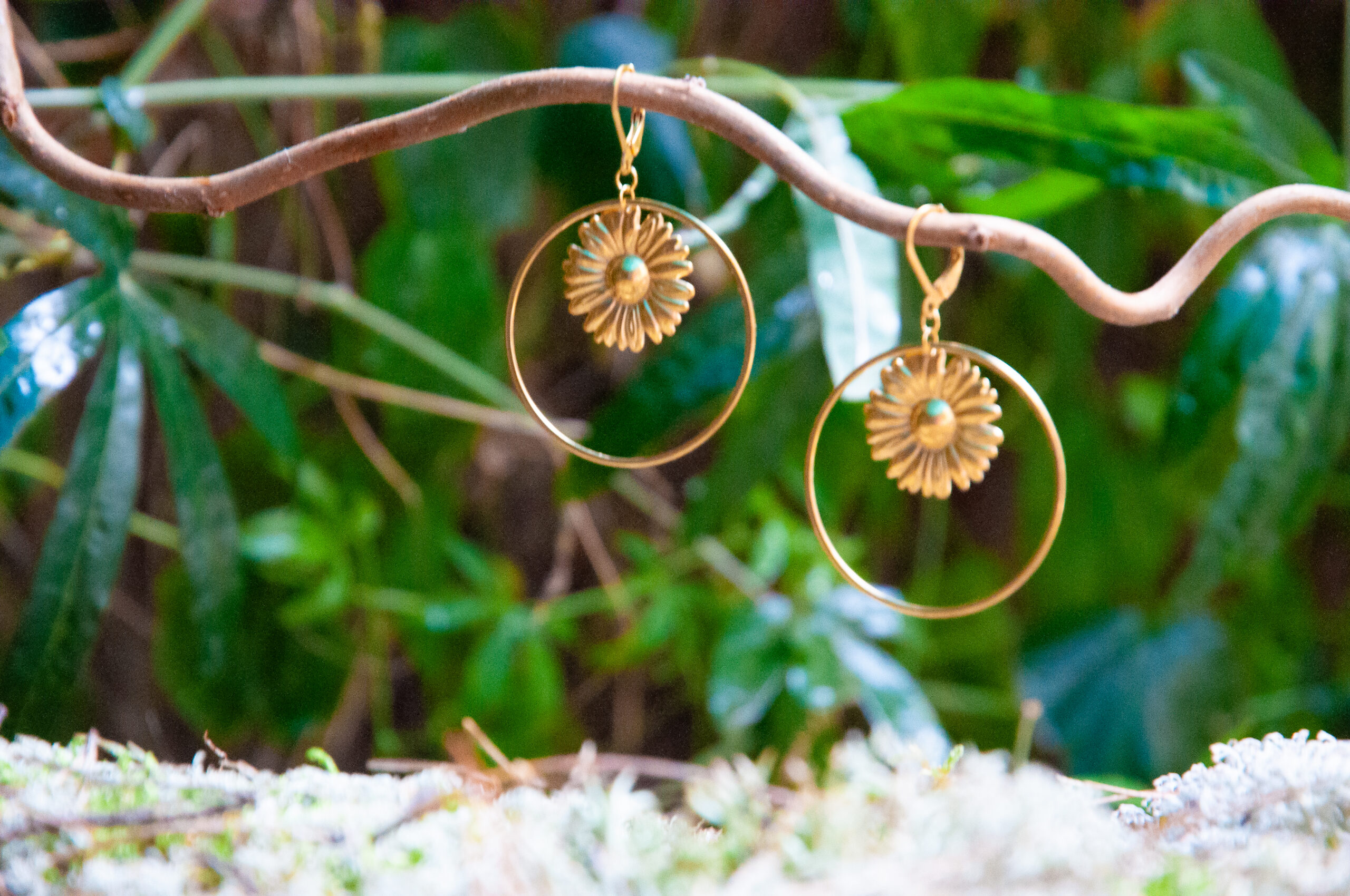 Ces créoles dorées jouent entre nature et poésie. La marguerite fleurie avec délicatesse les boucles. Ces bijoux peuvent être personnalisés et accompagnés d’un collier ou bracelet : parlons-en après leur réservation.